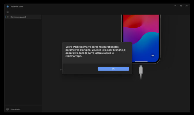 Dans de nombreux cas, le problème est lié au niveau de charge de la batterie. Lorsque l’appareil n’est pas suffisamment chargé, la restauration échoue. La solution consiste à laisser l’iPhone ou l’iPad branché en charge jusqu’à 100 %, puis relancer la restauration via l’application Appareils Apple pour PC. Une fois la batterie pleine, l’opération se déroule normalement, sans manipulation complexe.